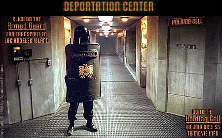 TRANSPORT TO LOS ANGELES ISLAND LEAVING IMMEDIATELY, TO YOUR LEFT. ENTER THE HOLDING CELL ON YOUR RIGHT FOR MOVIE INFORMATION.